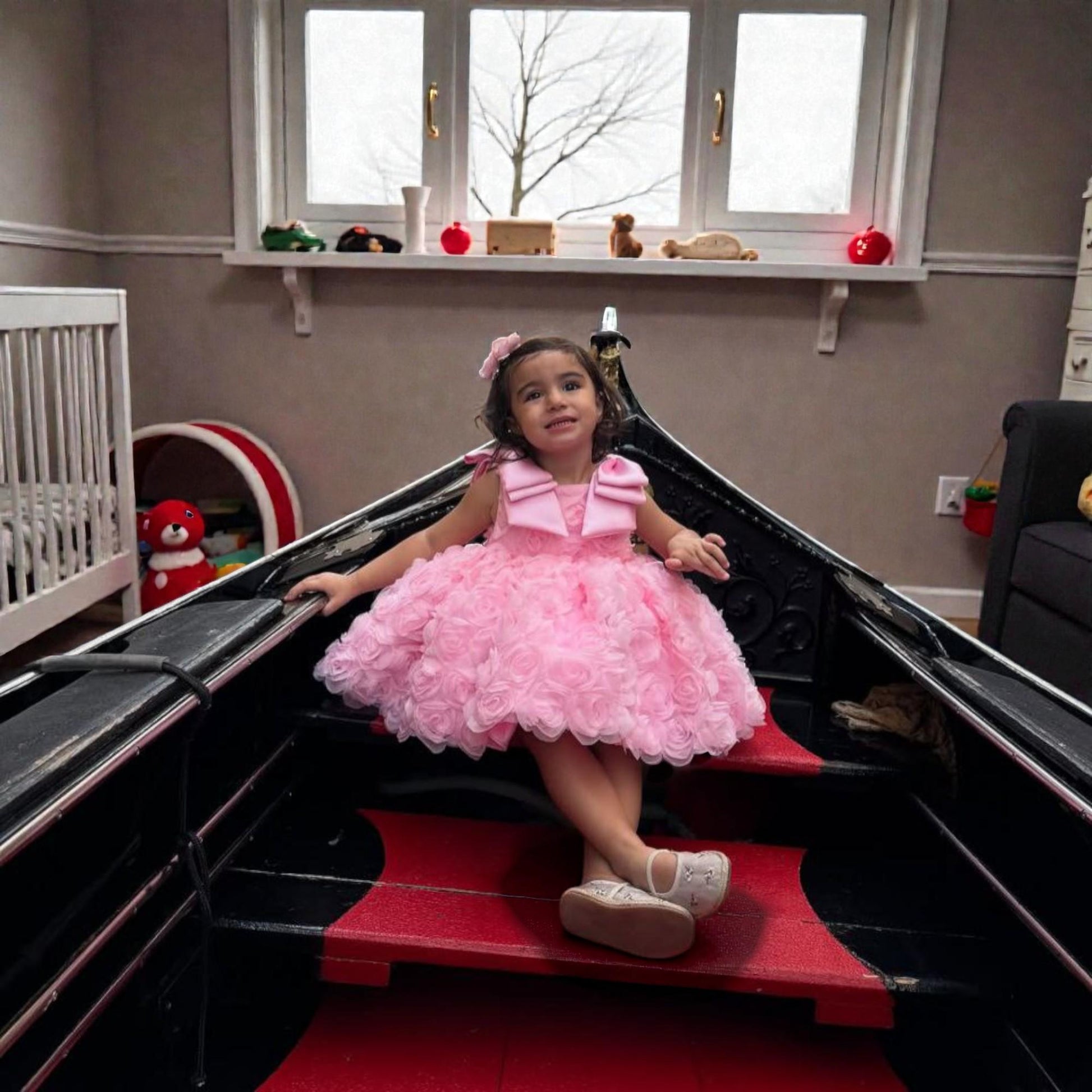 A couture-inspired pink birthday dress adorned with three-dimensional floral appliqués. Designed for high-end celebrations and luxury birthday photography.