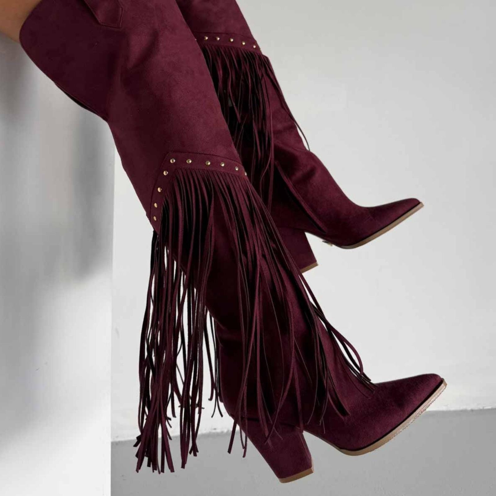Burgundy Fringe Knee High Suede Boots | Western Cowgirl Style | Pointed Toe Block Heel Boho Boots for Women
