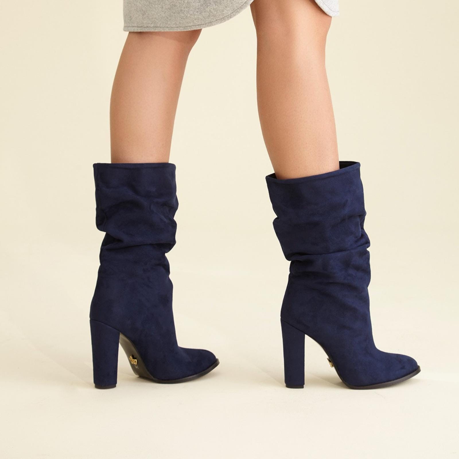 Crafted from soft faux suede, they feature a relaxed shaft design, pointed toe, and comfortable high block heel that elongates the legs while providing stability.