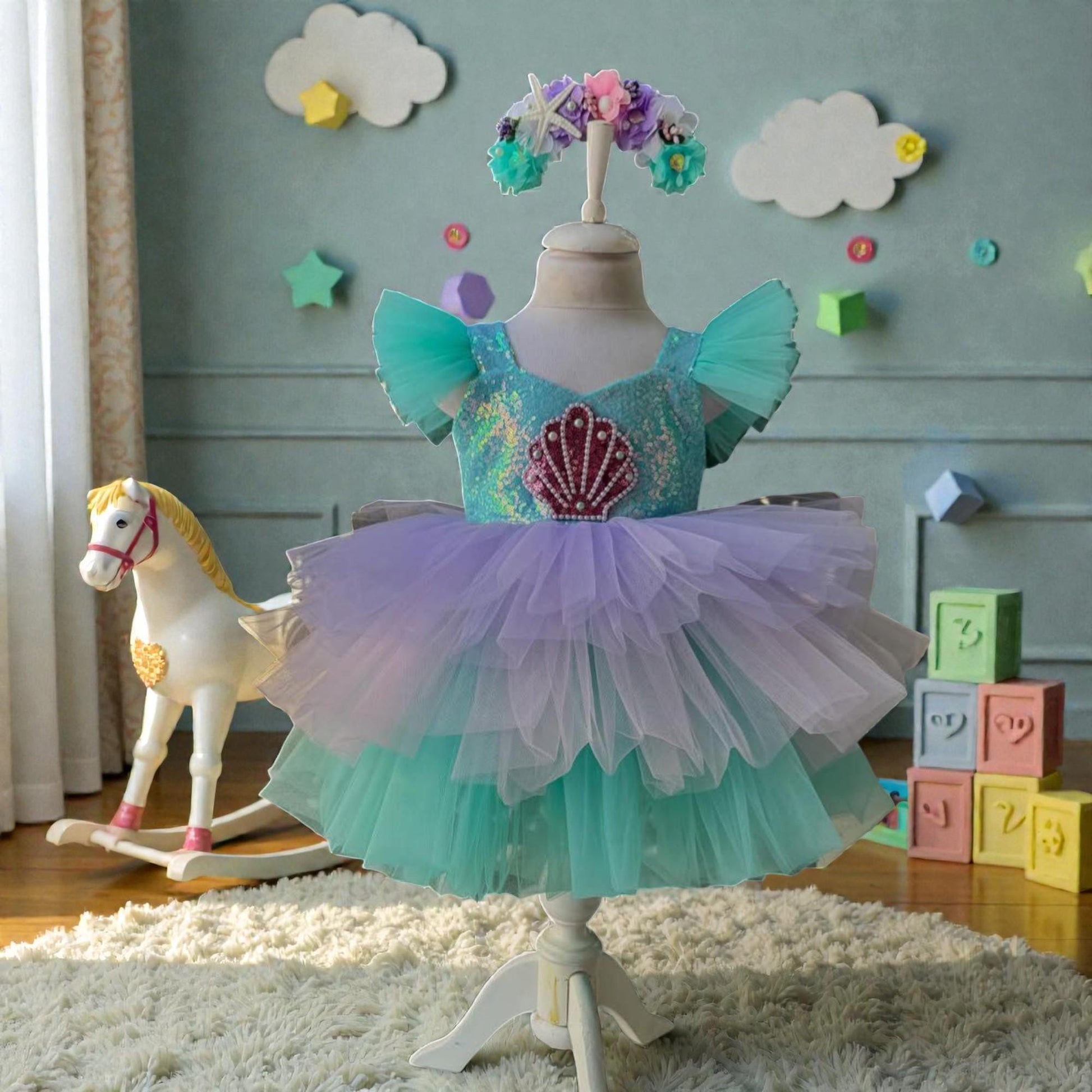 This pastel mermaid baby dress blends soft purple and mint tones into a dreamy ocean-inspired birthday look. Featuring layered tulle, shimmering shell detail, and handcrafted finishing, this dress creates a magical silhouette perfect for first birthday celebrations.